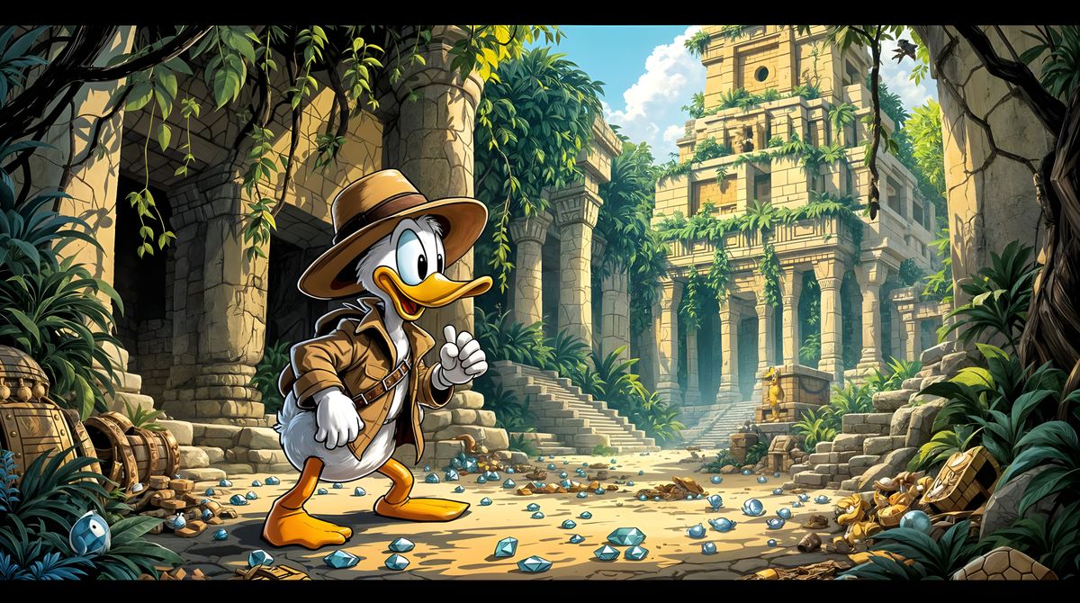 This image shows Donald Duck as an animated treasure hunter exploring Mayan ruins. The cartoon-style art features an archeological adventure filled with diamonds and pearls.