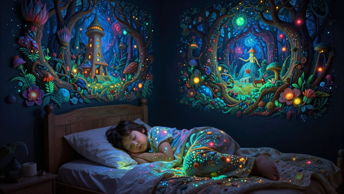 This image shows a child's bedroom at night, with a sleeping child nestled in bed. The walls feature hidden, intricate fantasy paintings that glow in the dark.