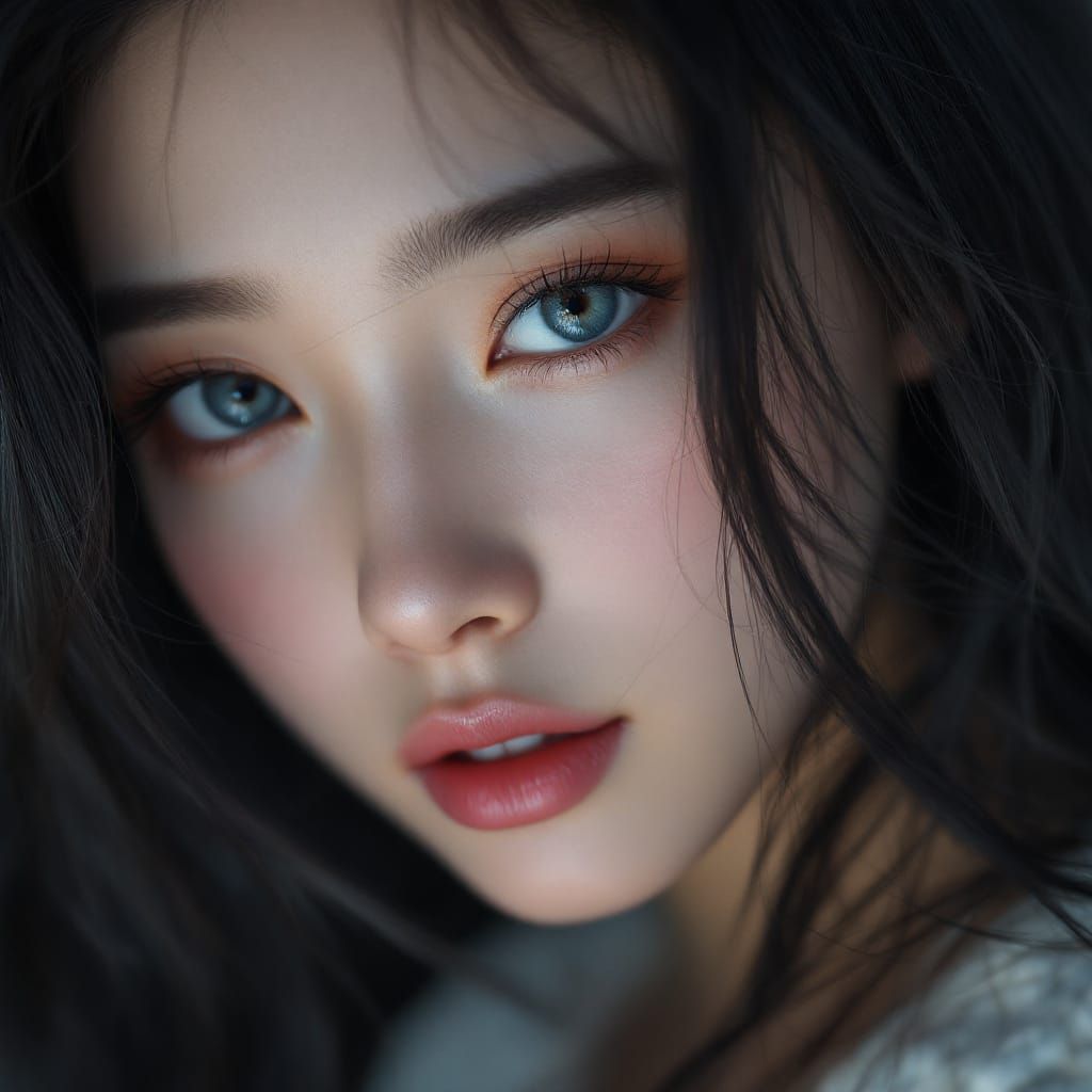 This image showcases an ultra-realistic CG portrait of a striking young Korean woman with flowing hair and captivating blue eyes. Featuring cinematic lighting and exceptional detail, it focuses on her beautiful face.