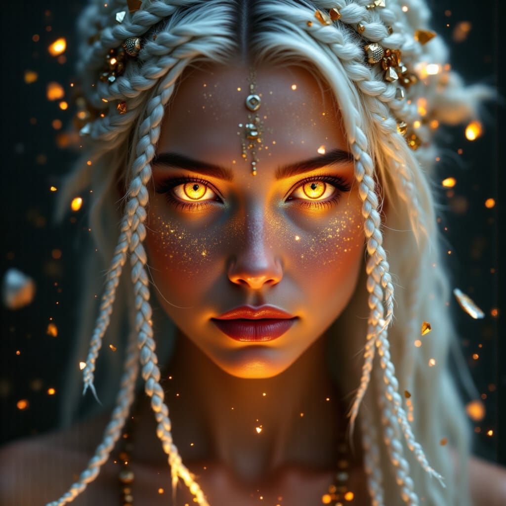 A striking picture of a young woman with white braided hair and glowing gold eyes. Runes mark her face, and tribal jewelry adorns her. Floating silver and gold shards refract light in a crystalline, cinematic style.
