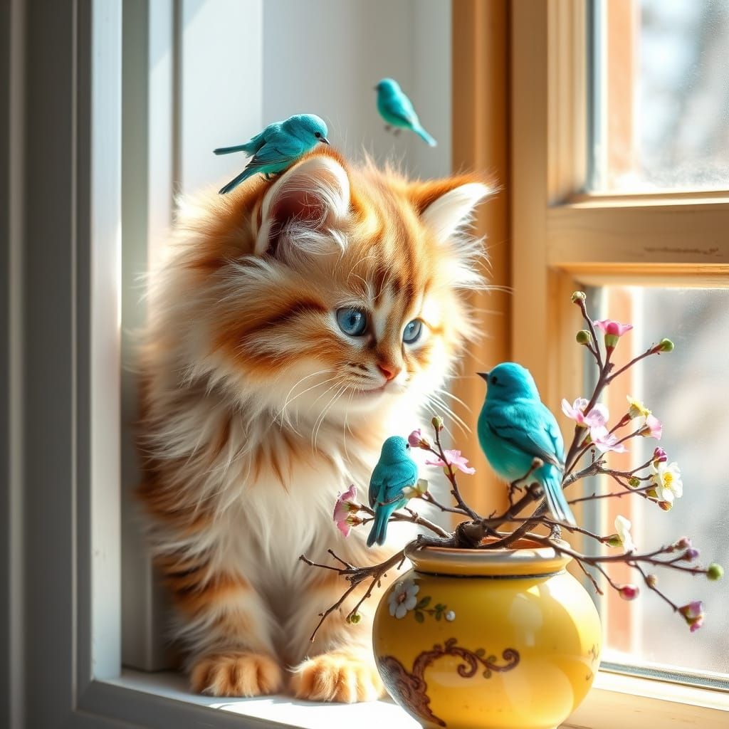 A profile view of a smiling Siberian kitten with mixed blonde and brown fur and blue eyes, looking out a sunny window. Turquoise birds surround the cat, with spring flowers in a yellow pot.