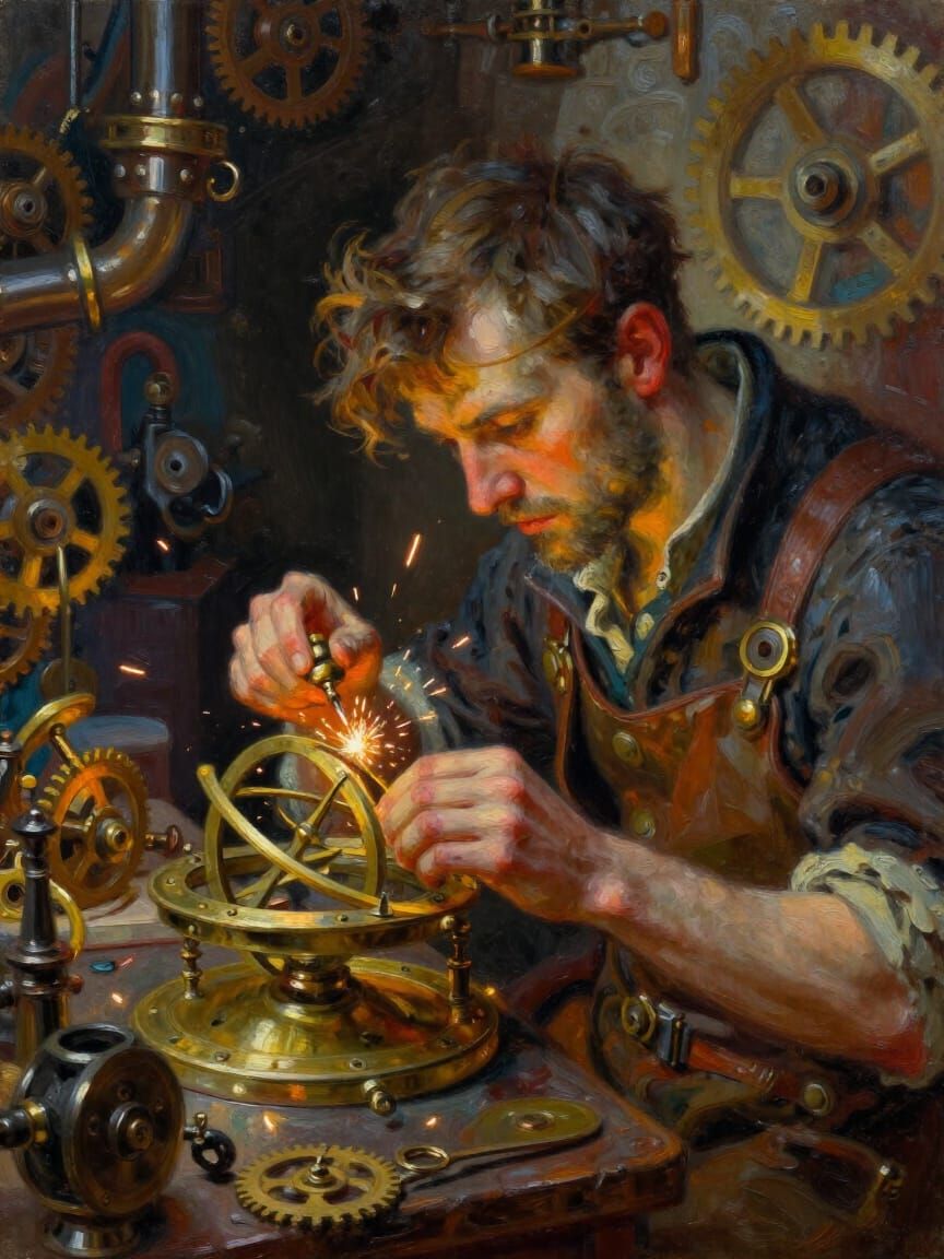 This image shows a steampunk artisan intensely focused on polishing a brass astrolabe. Sparks fly as they work amidst a detailed workshop, rendered in a richly textured oil painting style with thick, colorful impasto layers.