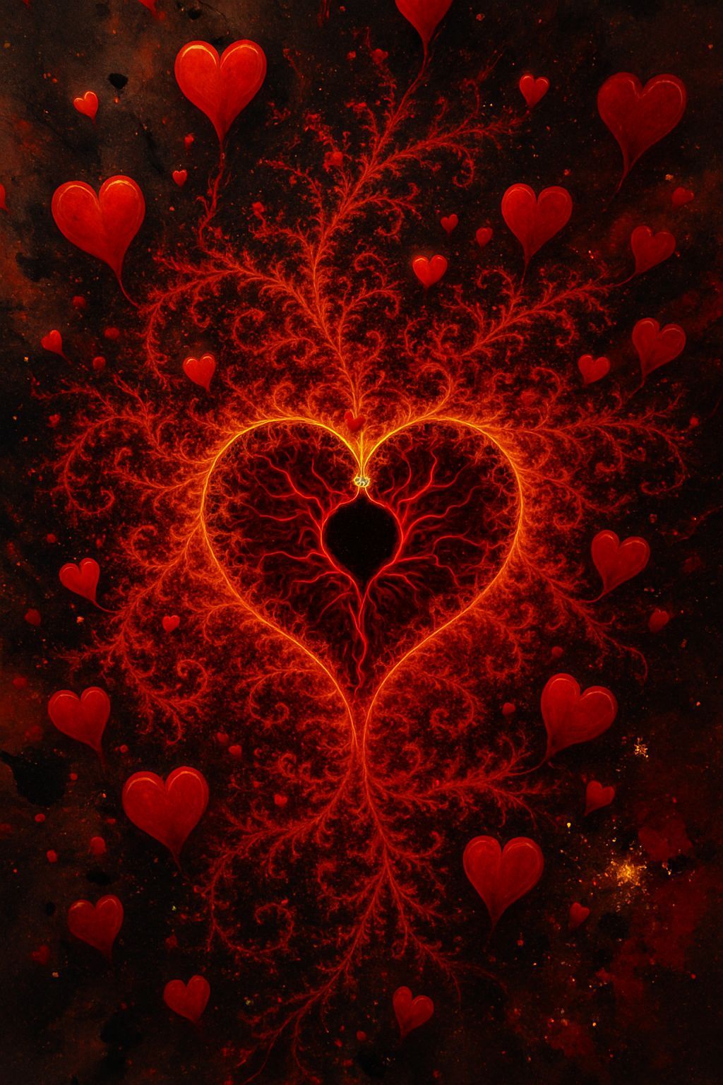 This AI-generated image features a complex fractal pattern resembling a heart, adorned with red and orange hearts, ink splashes, blood flow, and glittering gold sparks.