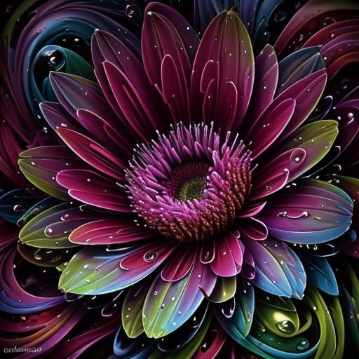 A macro shot of blooming flowers in a field using a psychedelic and vibrant oil painting style. The image has swirling patterns, glossy dew drops, and warm sunlight in pastel colors, rendered in 3D.