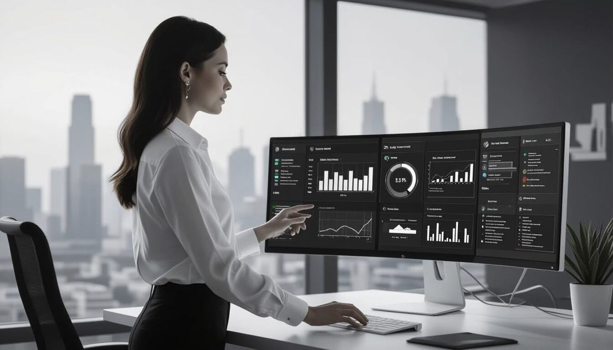 A striking picture of a businesswoman using an AI procurement dashboard in her modern office. The scene is in black and white with a futuristic aesthetic, featuring a bustling city skyline.