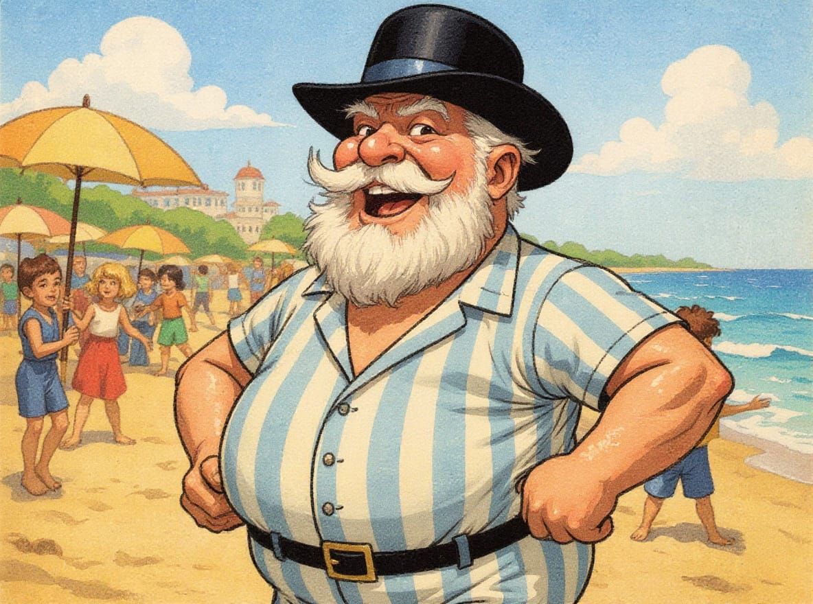 A vintage comic illustration of a French socialist leader enjoying a beach vacation. The cartoonish scene features a cheerful seaside setting with exaggerated features and a retro summer atmosphere in a colorful, inked style.