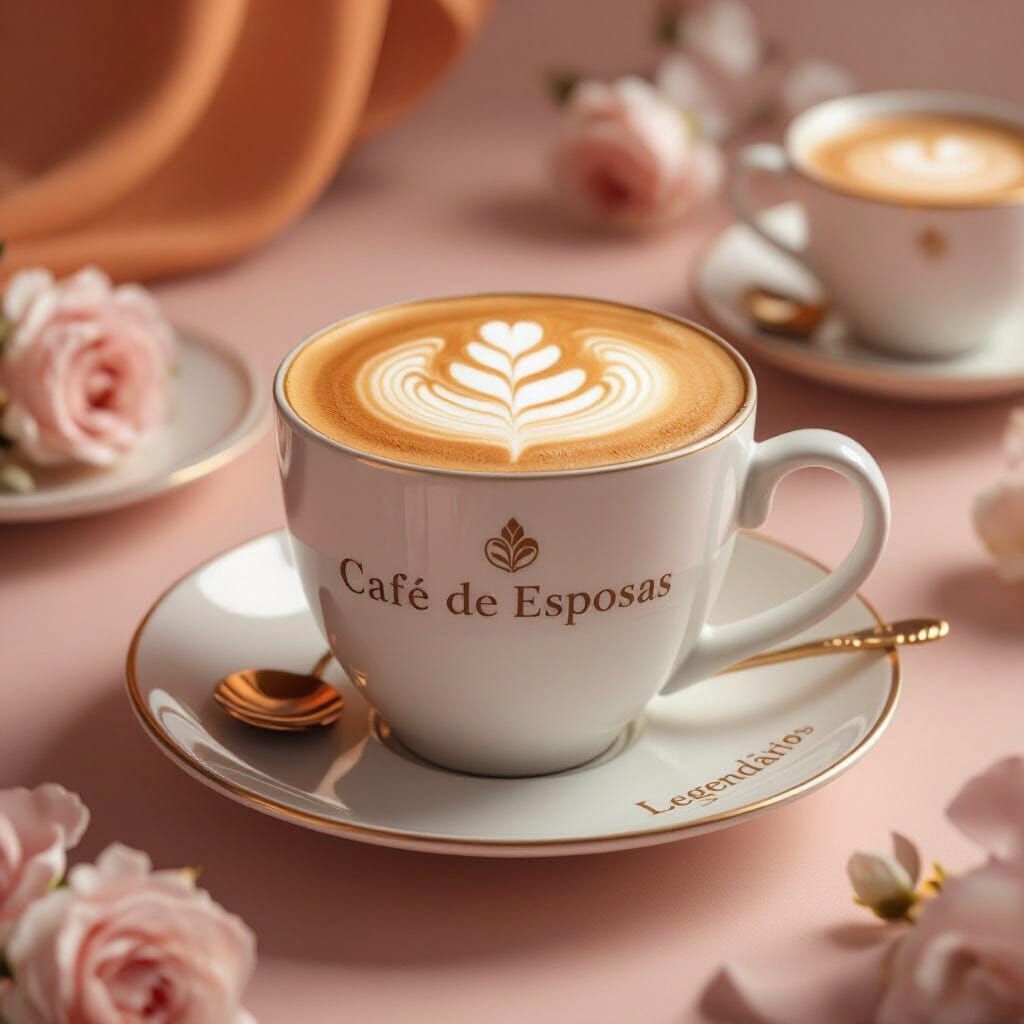 This image presents a sophisticated and delicate coffee scene for the "Café de Esposas" event. It features elegant tones, a detailed coffee cup, and warm invitation elements, rendered in a photorealistic style with soft lighting.