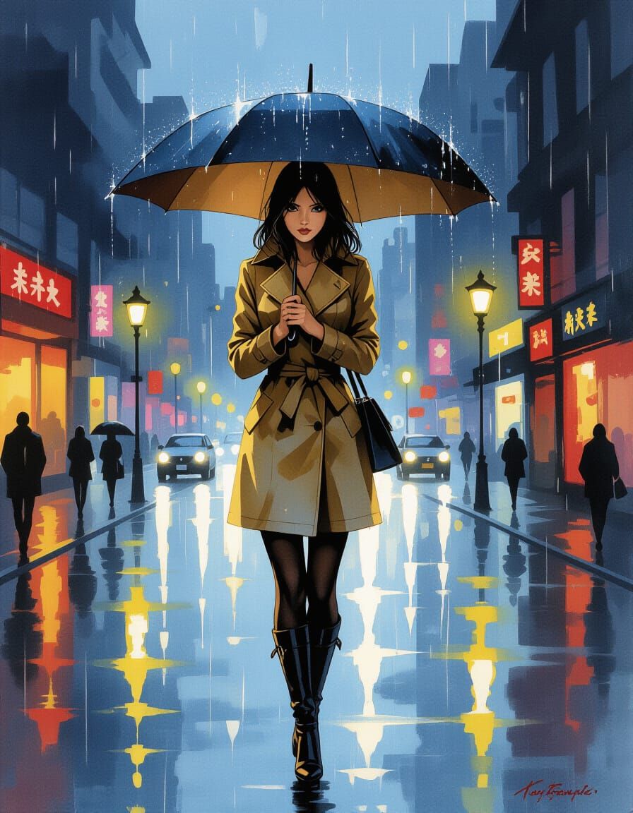 A lone woman walks a rainy city street at dusk, her umbrella catching the light. The image blends dramatic lighting with impressionistic urban scenery and manga-inspired details, rendered with comic book realism.