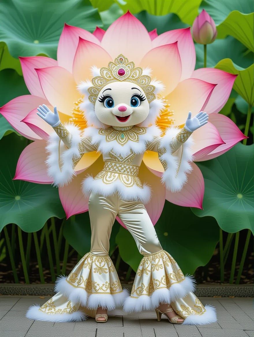 anthropomorphic holmium disco dressed up in Nelumbo nucifera couture sleeveless jumpsuits with lotus cruffles on wrists ankles and neck with elaborate faux fur lotus headpieces doing the YMCA huge lotus decoration backdrop