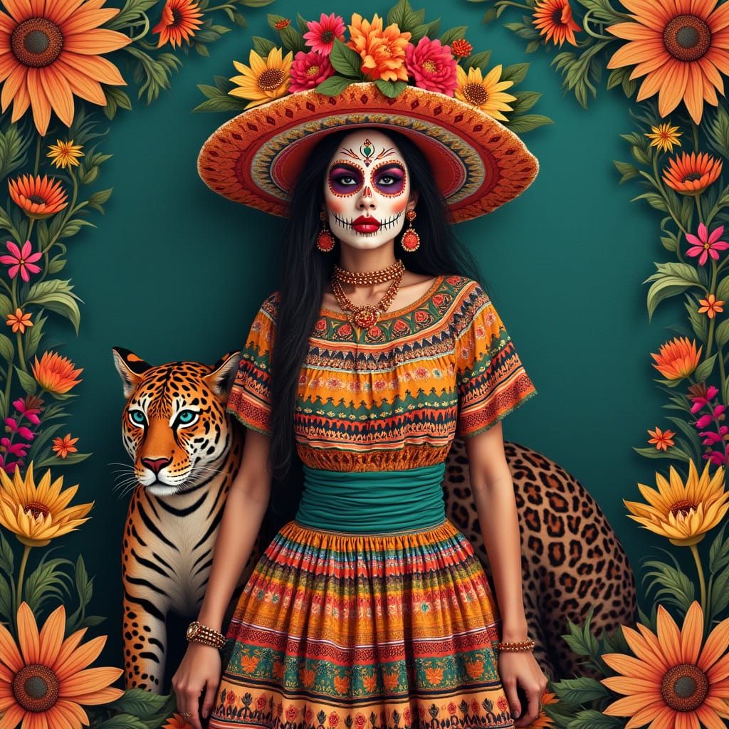 A vibrant image showcasing a Mexican woman in traditional clothing. She is surrounded by marigolds, cacti, bougainvillea, a decorated skull, and a jaguar, set against a backdrop of vivid colors in earth tones, with a handcrafted aesthetic.