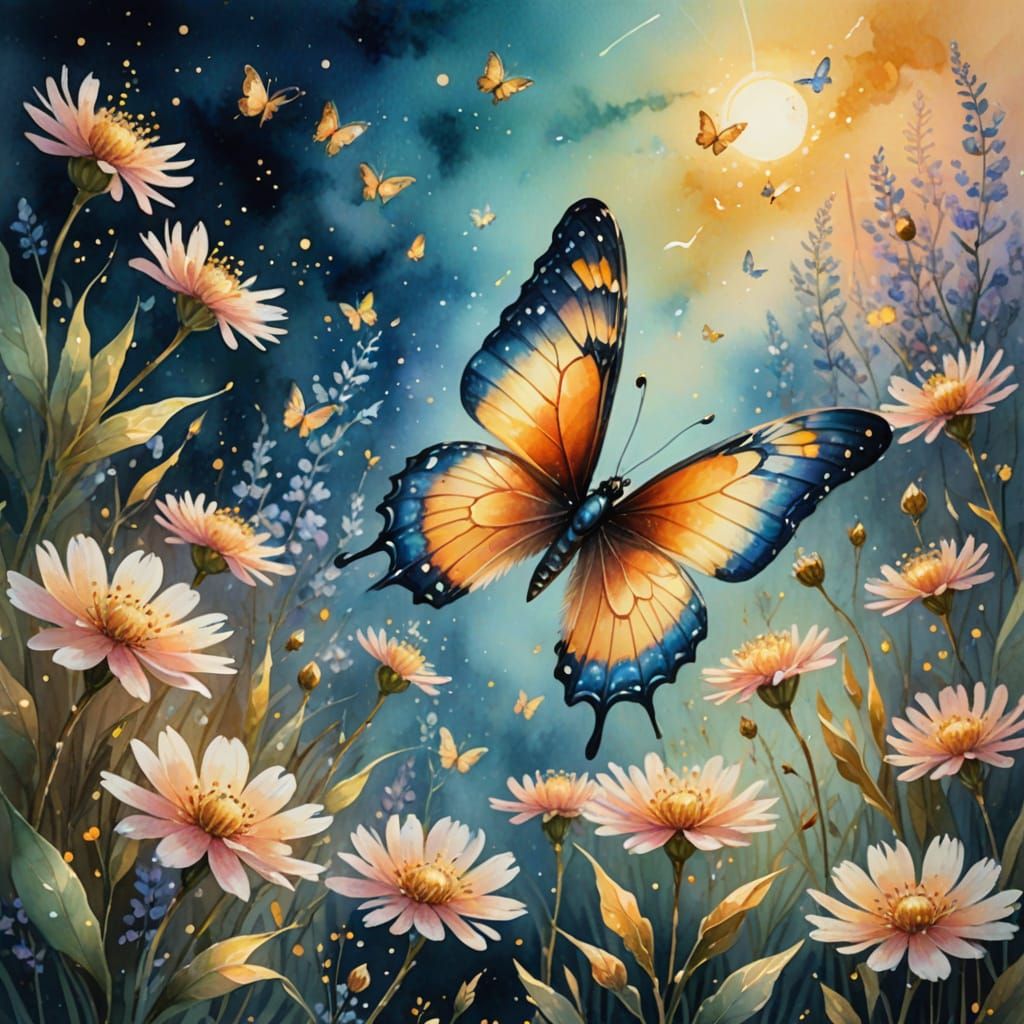 This watercolor painting features a crystal butterfly with softly glowing wings amidst vibrant, bioluminescent flowers. The art uses wispy brushstrokes and pastel colors for an enchanted, fantasy atmosphere.