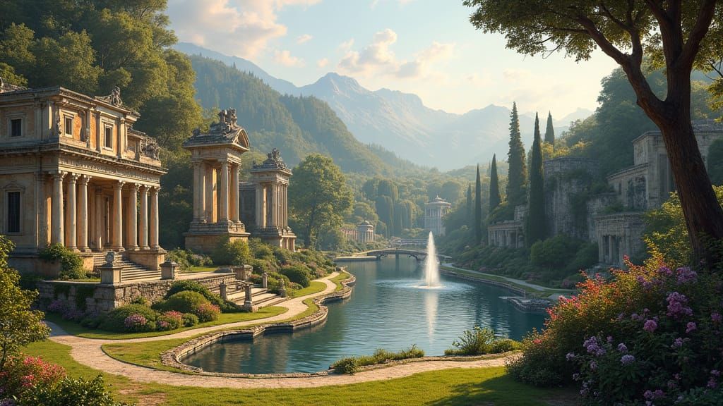 This idyllic landscape combines ancient Greek ruins with modern urban parks, set amidst the rolling English countryside, featuring intricate stonework, ornate iron gates, and serene water features, all bathed in warm sunlight and evoking a fantastical atmosphere reminiscent of detailed oil painting and f...