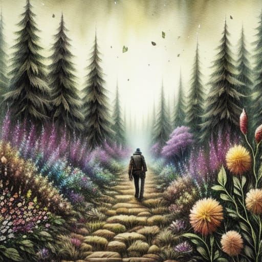 This image is a melancholic watercolor depiction of a lone figure walking through a desolate woodland, surrounded by wilted flowers in a faded, black and white color palette.