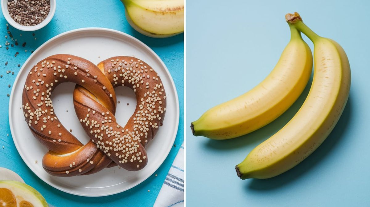 This image shows a vibrant and stunning composition with two distinct scenes. One scene features a fresh pretzel, and the other showcases bananas. The image is a digital masterpiece.