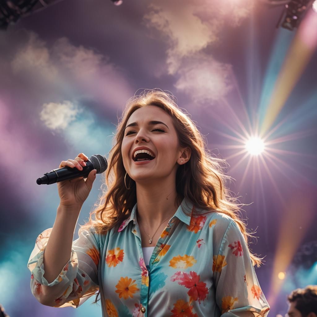 This image shows a girl singing on a vibrant stage bathed in heavenly sunlight. The soft focus and bright beams create a divine, ethereal atmosphere.
