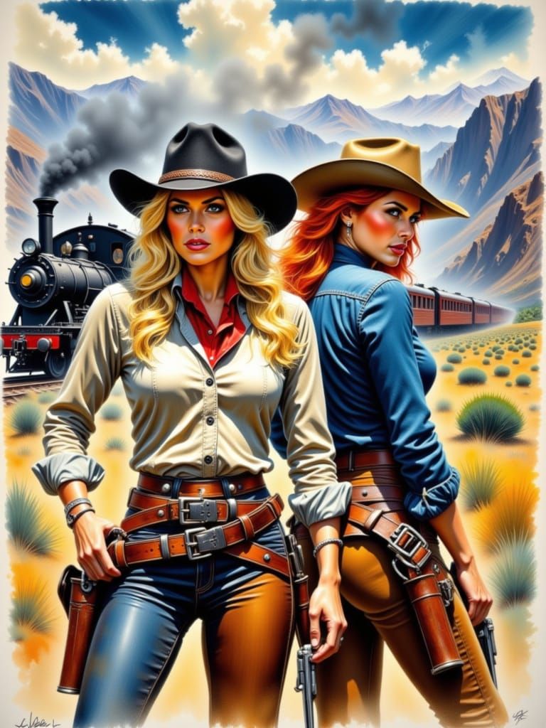 This image features two wild west female gunfighters in a vibrant, blacklit charcoal impasto style, reminiscent of vintage pulp magazine covers. A steam engine is visible in the background.