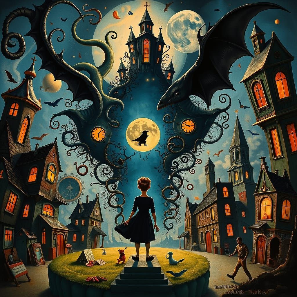 This image depicts a chaotic and surreal scene, blending elements of dada and magic realism with a highly detailed, whimsical aesthetic. It explores themes of language and art.