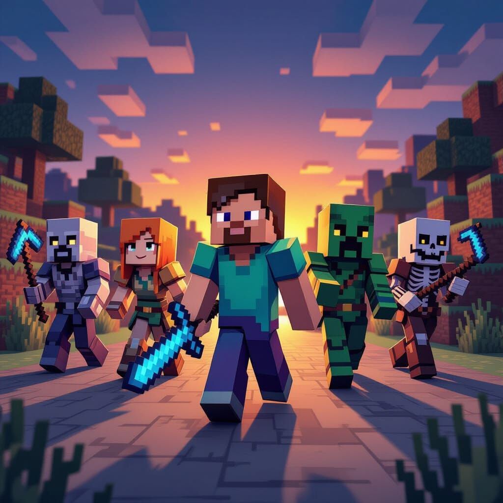 This image features iconic Minecraft characters like Steve and Alex, along with mobs, all in detailed diamond armor wielding weapons. Set in a blocky world during a vibrant sunset, the scene showcases dynamic lighting and long shadows.