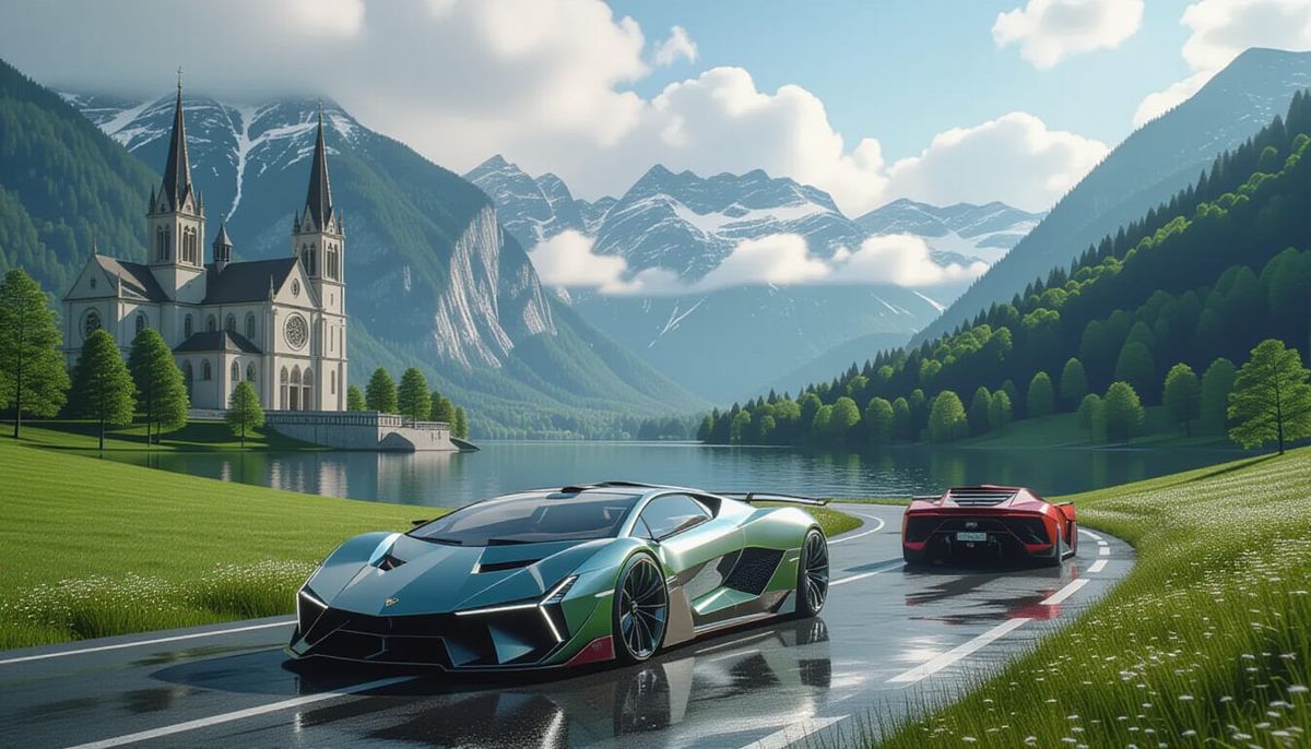 A hyperrealistic 3D rendering of a Lamborghini Terzo Millennio in a vibrant, conceptual color scheme, set against the backdrop of the Italian Alps in spring. The landscape features a cathedral and lake.
