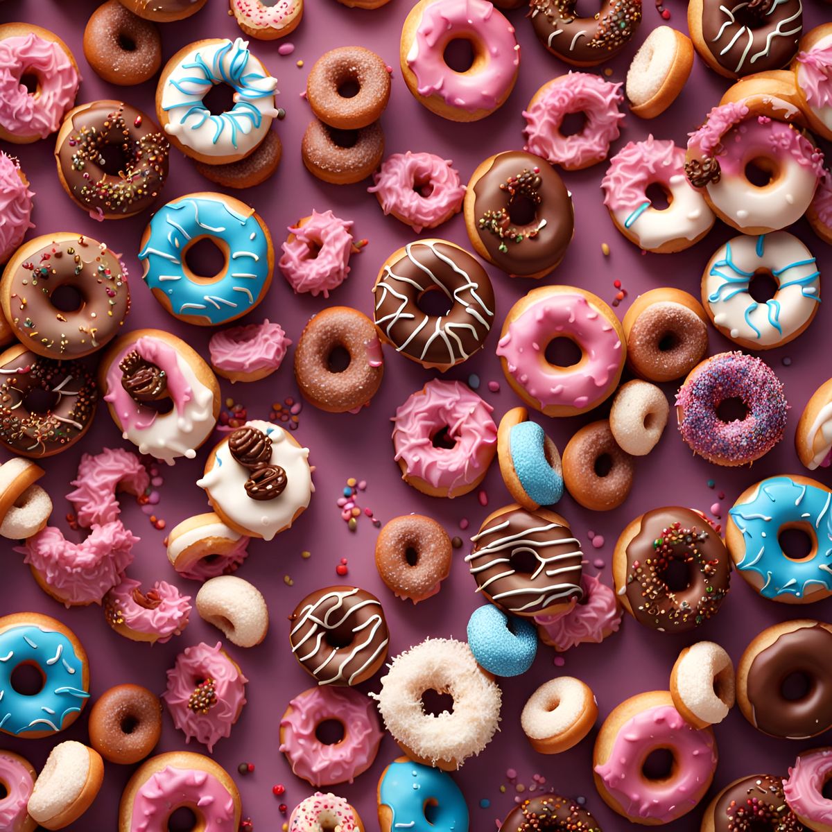 This image shows an overhead shot of donuts arranged in an American style. The scene incorporates elements of Hanukkah, the Jewish holiday, in a detailed and colorful fantasy concept.