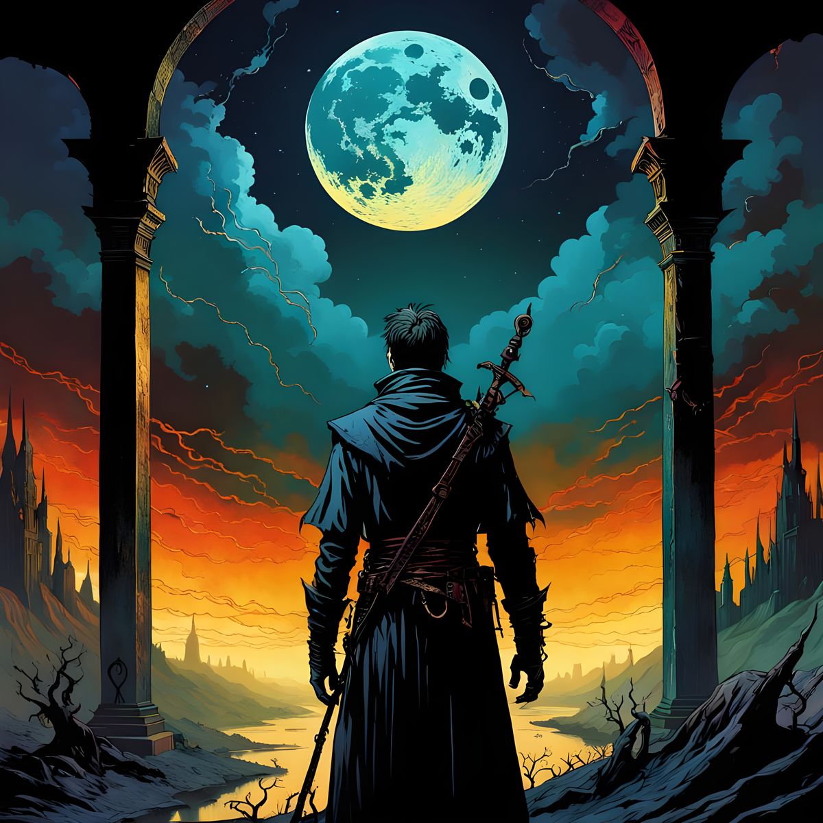 A vivid image of a twilight moonscape blending gothic and folk art elements. The scene evokes a mysterious, ominous, post-apocalyptic world with complex details and dynamic lighting, reminiscent of early 20th-century academic art.