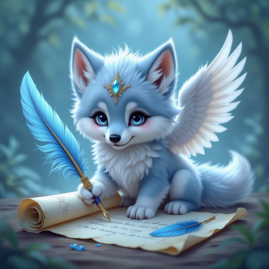 This image shows a baby griffin-wolf hybrid writing on a parchment scroll. The creature has fluffy fur and delicate wings, depicted with hyperdetailed textures in a whimsical, dreamy fantasy style.
