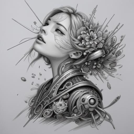 This image shows an abstract floral design with mechanical silver elements. The artwork is rendered as a hyperrealistic pencil sketch with futuristic undertones.