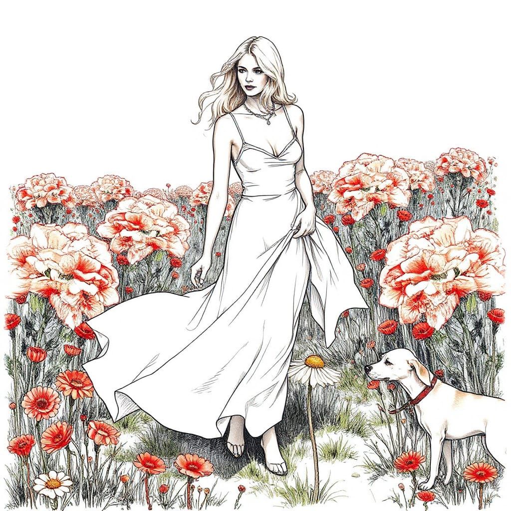A detailed ink drawing of a blonde woman in a white dress walking her dog through a flower-filled meadow. The artwork features ornate patterns and expressive linework.