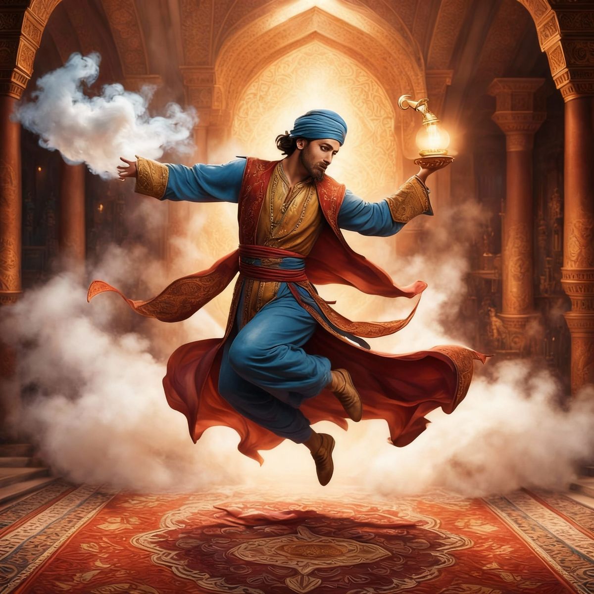 Arabian Nights Genie appearing in a cloud of smoke from a small burnished copper oil lamp, conjuring up a silk-tasseled red and gold flying carpet in front of an astonished Aladdin. Hyperrealistic, splash art, concept art, mid shot, intricately detailed, color depth, dramatic, 2/3 face angle, side light, ...