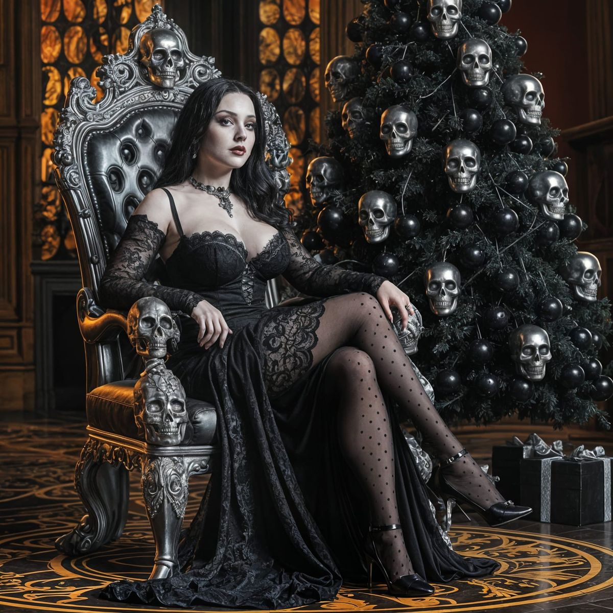 This image shows Morticia Addams in a black lace gown, seated on a silver skull throne. Behind her is a black Christmas tree decorated with silver skulls, all set within a gothic castle hall, rendered as splash art.
