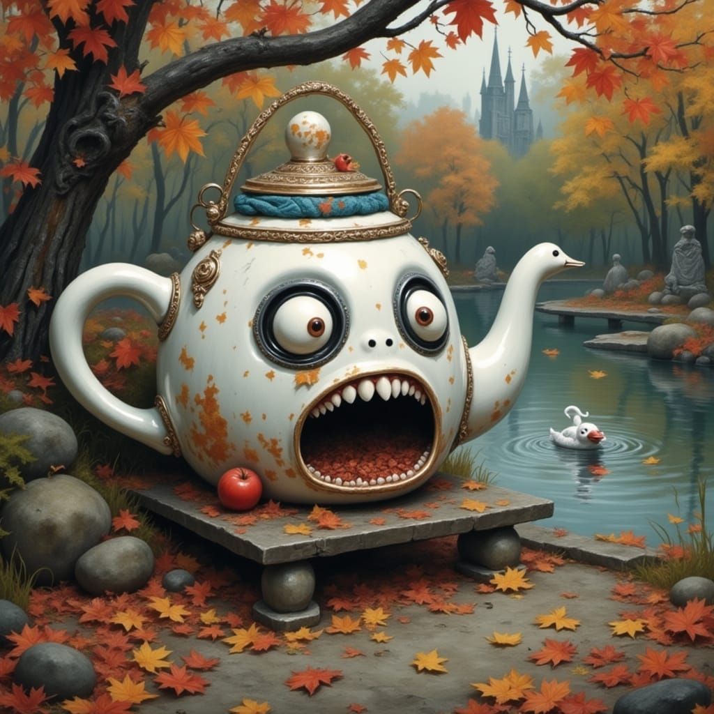 This image shows a teapot wearing a scarf being chased by a fierce goose in a colourful autumn city park setting, with a pond and ducks nearby.