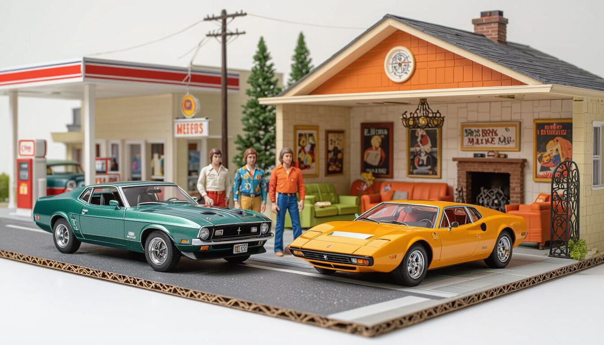 This image showcases a detailed diorama of a 1970s street scene featuring iconic American and Italian muscle cars, a retro gas station, and period-accurate architecture. Rendered in a cinematic 3D style with dynamic lighting.