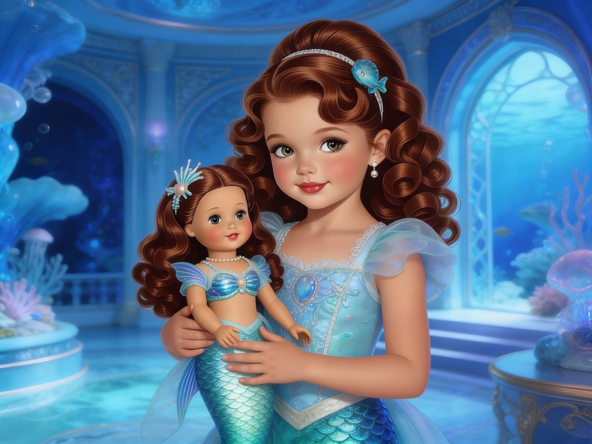 This image features a surreal interior with a fancy blue ocean theme. The subjects are adorned with ocean-inspired outfits and accessories, creating a whimsical underwater atmosphere.