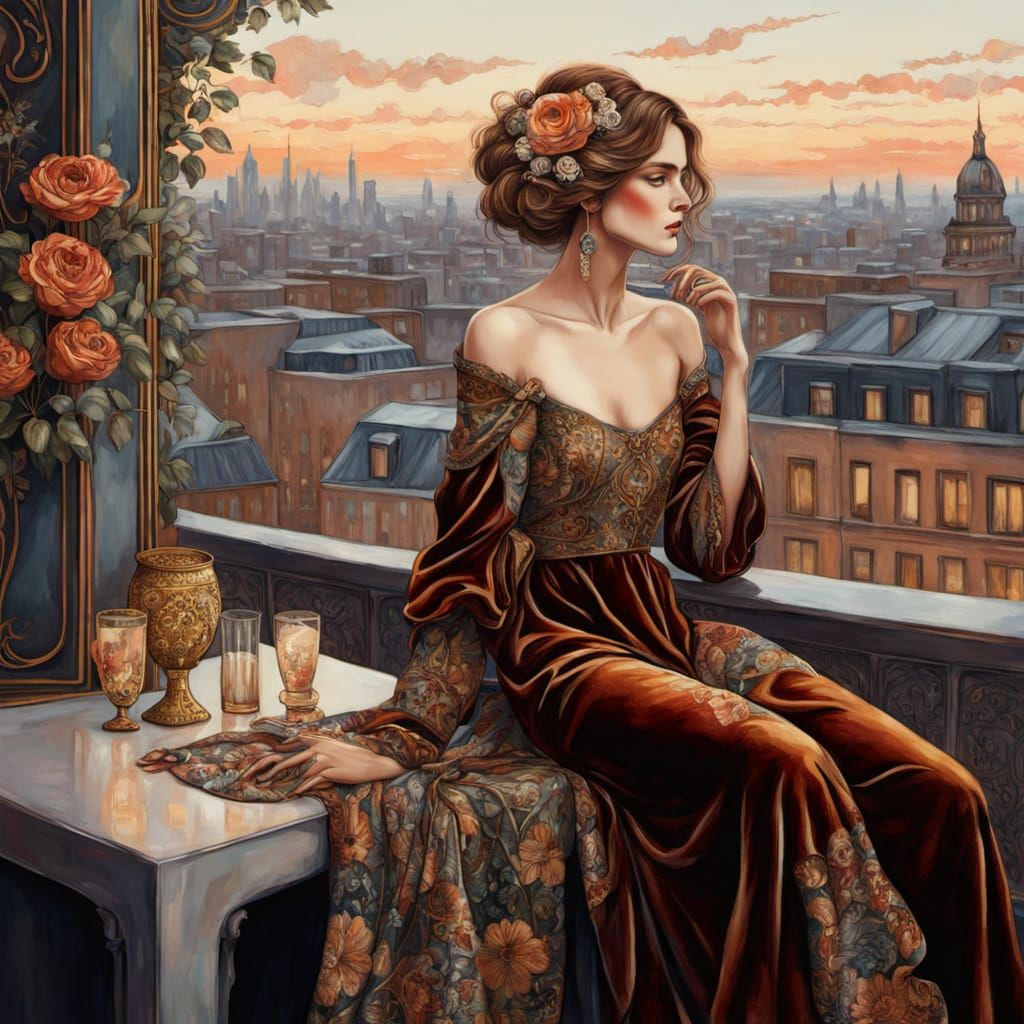 This oil painting showcases a fashionable homeless woman in a velvet gown at a rooftop bar. Art Nouveau style with intricate details and golden hour lighting creates an opulent scene.