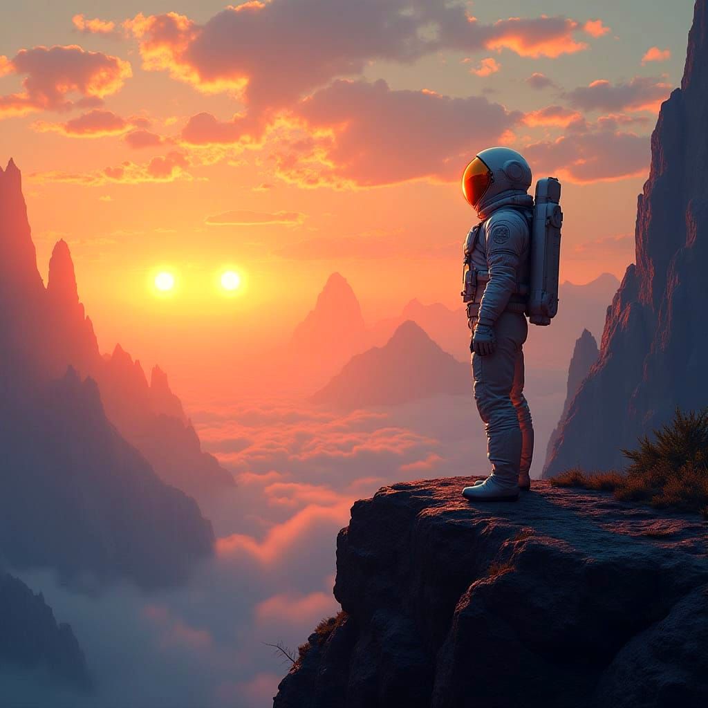 This breathtaking digital painting captures a lone astronaut standing on a ridge, gazing out at a stunning alien landscape bathed in the warm glow of twin suns setting behind jagged crystalline mountains, with iridescent particles dancing in the air.