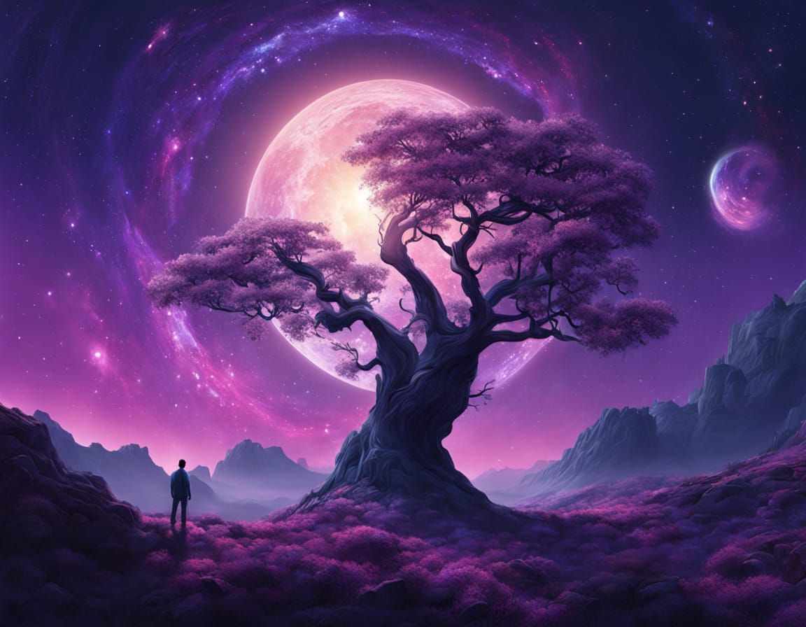 This digital matte painting depicts a serene landscape under a mystical, violet-starred sky with swirling nebulae. A lone ancient tree stands sentinel, bathed in ethereal celestial light.