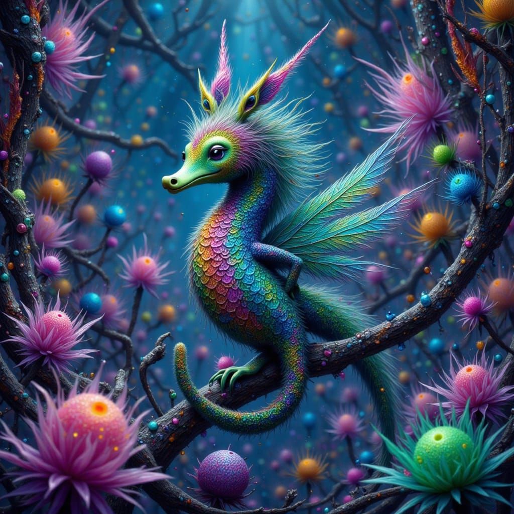 A striking picture of a miniature, winged seahorse glowing amidst alien flora. The fantastical creature is perched inside a crystal cave, rendered with shimmering, luminescent colors in a fairy punk aesthetic.