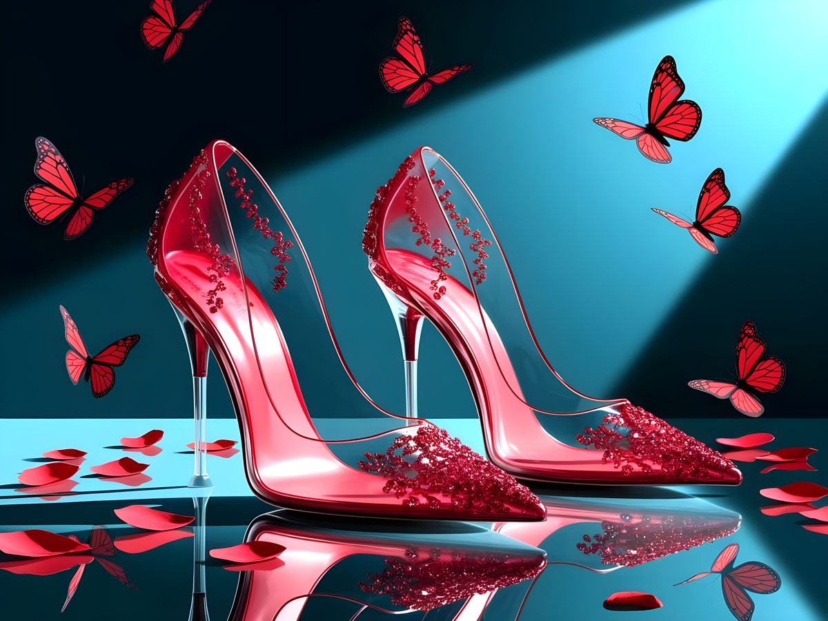 This image shows a pair of striking red high-heeled shoes amidst a whimsical scene of flying butterflies and scattered petals, set against a dark blue background with a hint of surreal fantasy.
