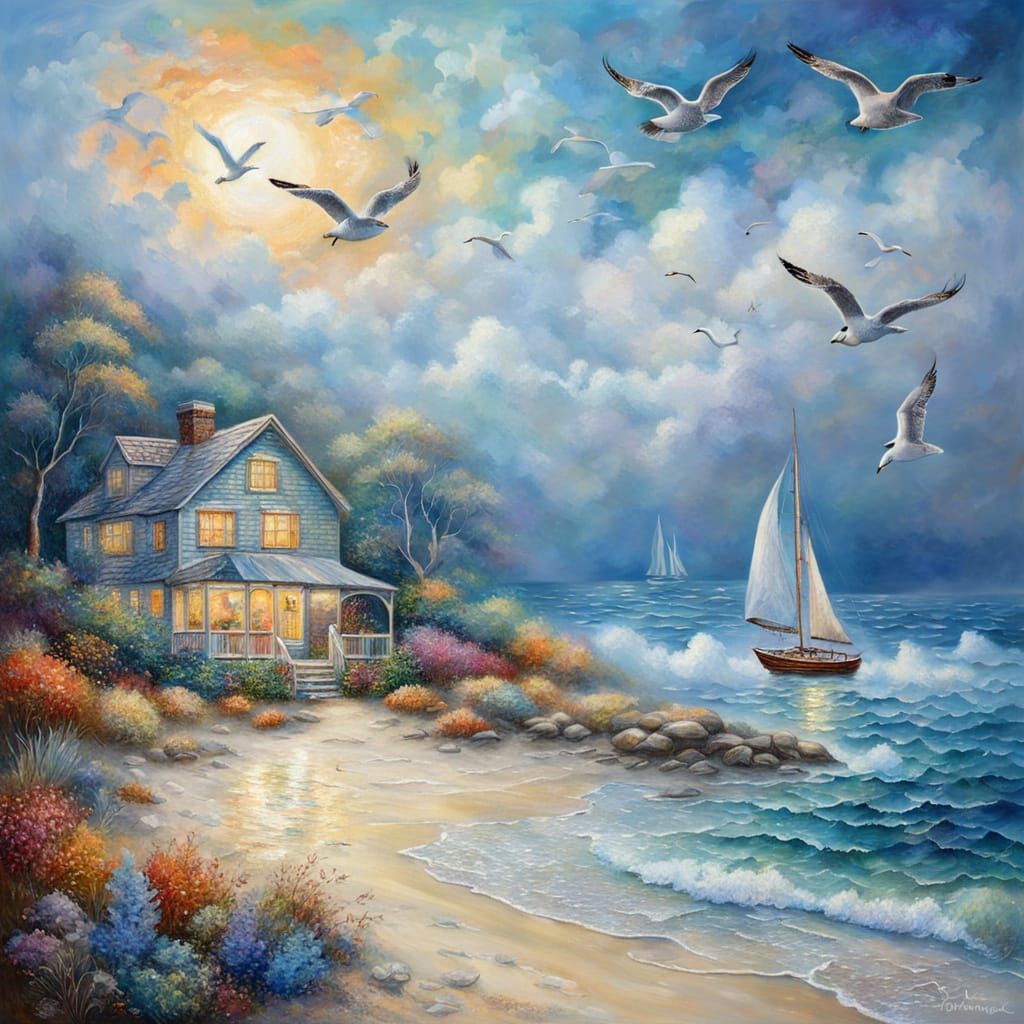 A vibrant impasto painting depicts a cozy beach cottage scene at summer's end. The artwork features a sailboat, sea turtle, and seagull in a hazy, dreamlike atmosphere. The style evokes impressionist paintings.