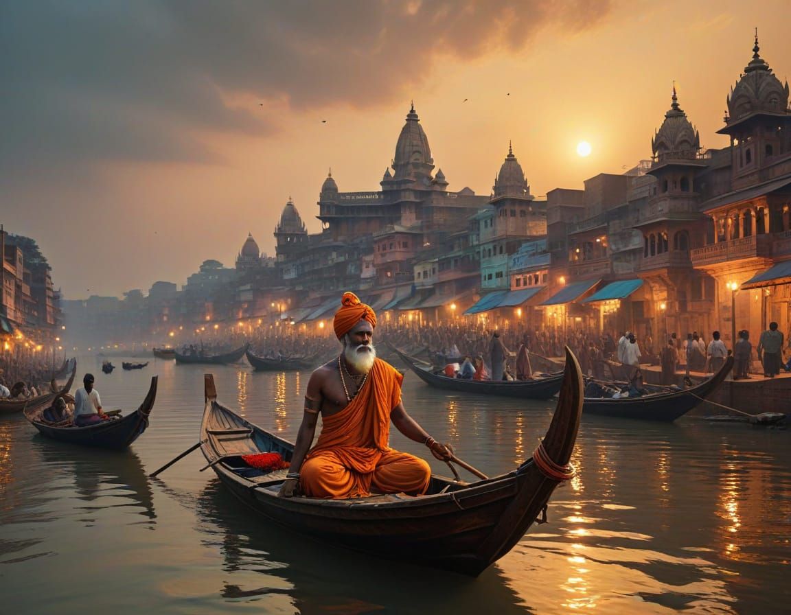 This image is a fantastical depiction of Varanasi, blending the mystical with the grotesque in a dreamlike atmosphere reminiscent of 16th-century Dutch master Hieronymus Bosch.