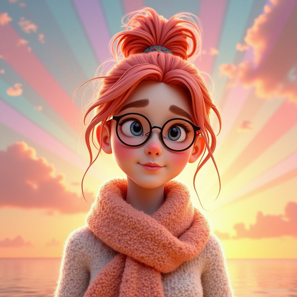 A digital 3D art image of a woman with rose amber hair in a messy bun, wearing glasses, a fluffy sweater, and scarf. The image has a bright, dreamy, high-gloss finish.