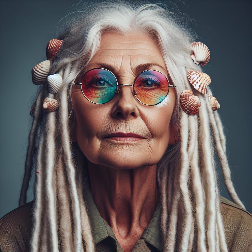 This image shows a distinguished older woman with seashell-decorated dreadlocks and rainbow glasses. Her calm expression and casual clothing create a relaxed, yet commanding portrait.