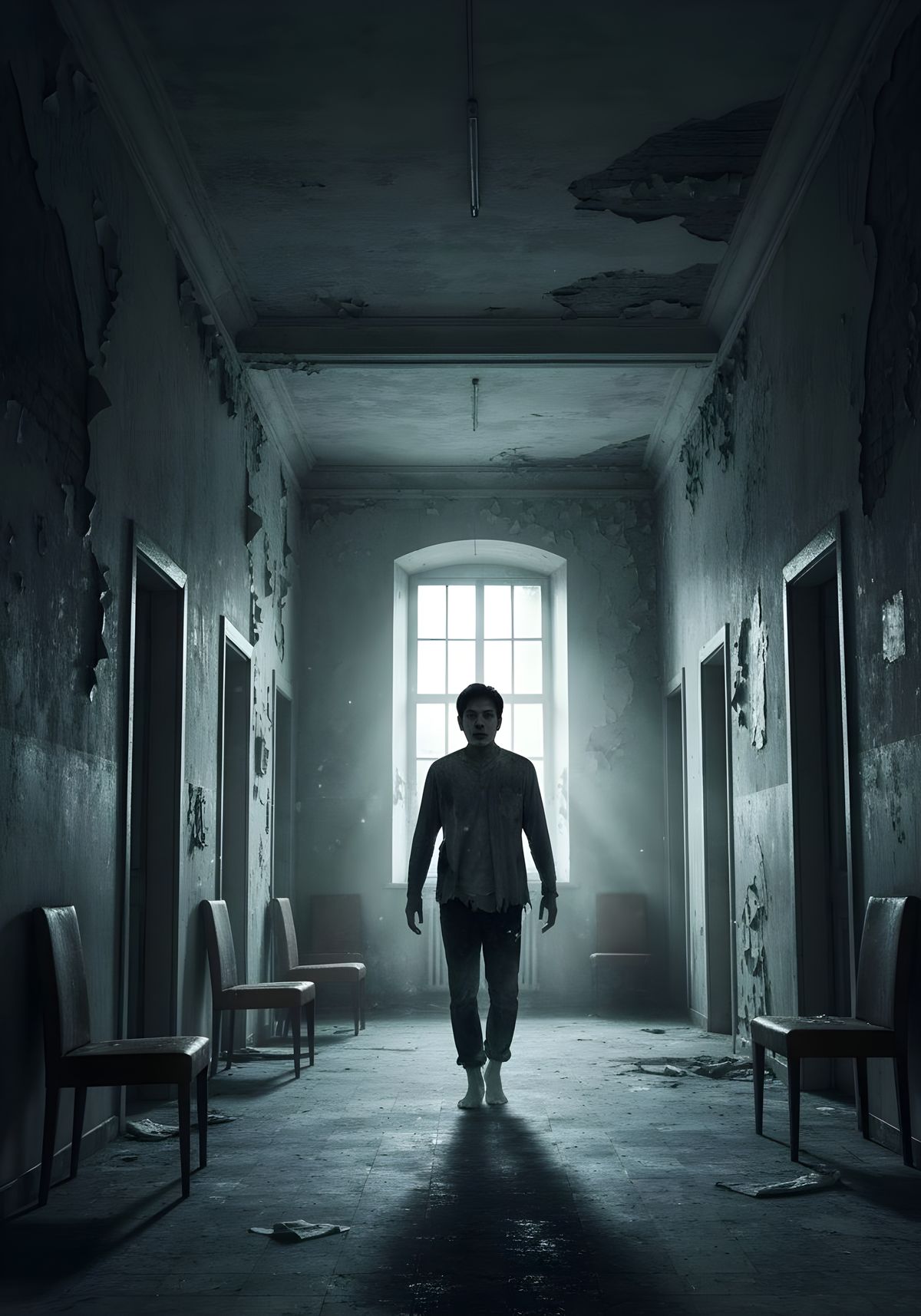 This image shows a chilling vintage photograph of a ghost, reminiscent of Beksinski's macabre style. The monochrome image, complete with a white border, features detailed 3D shading and dramatic lighting.