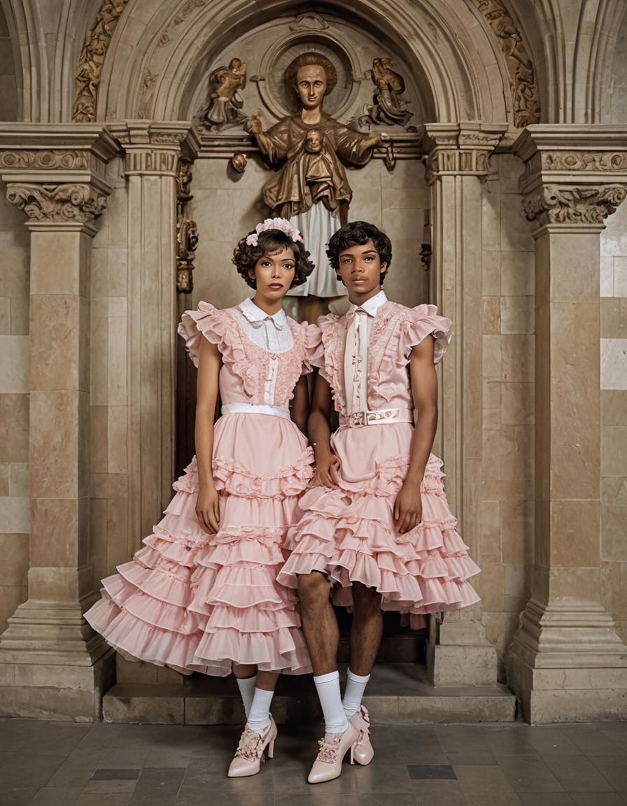 This professional portrait photography captures two young adults in formal dresses inside a church, featuring studio lighting and bokeh effects for a sharp focus.