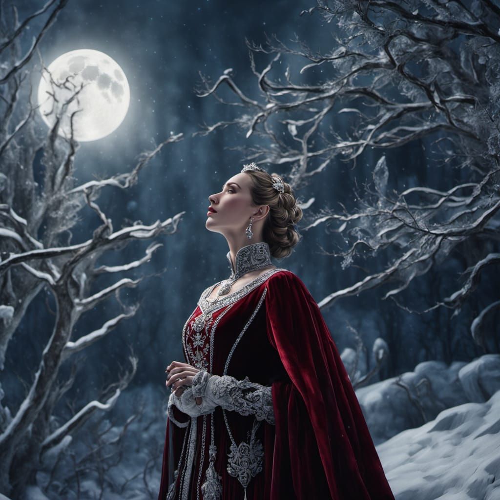 This image shows a regal woman in a snowy landscape, reaching for the moon. The portrait features glowing silver and crimson jewelry, set in a winter fantasy scene with soft moonlight and ethereal glows.