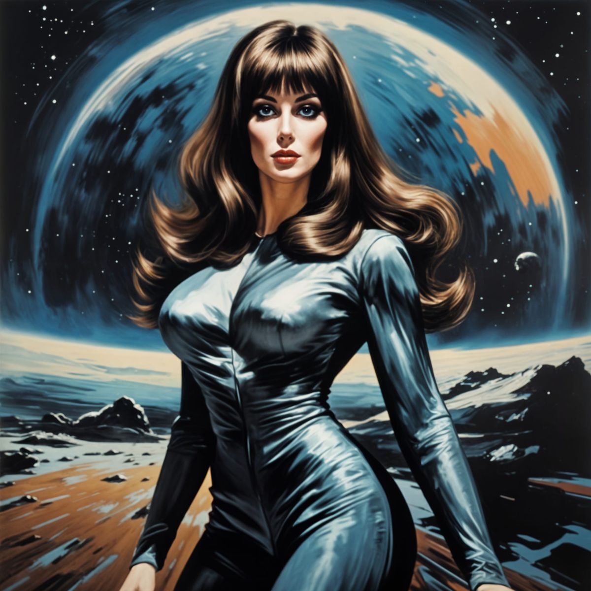 This abstract impasto illustration depicts a 1960s space girl with long hair and a textured space dress, standing on a spaceship deck with cosmic views.