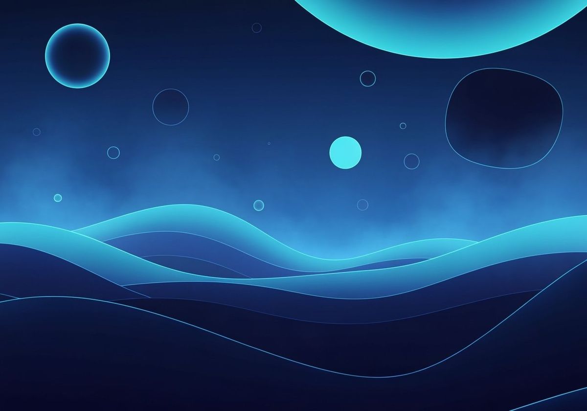 This image showcases a surreal, blue-dominant dreamscape with weightlessly drifting elements. Rendered in a futuristic synthwave style, it features glowing edges and a soft neon haze.