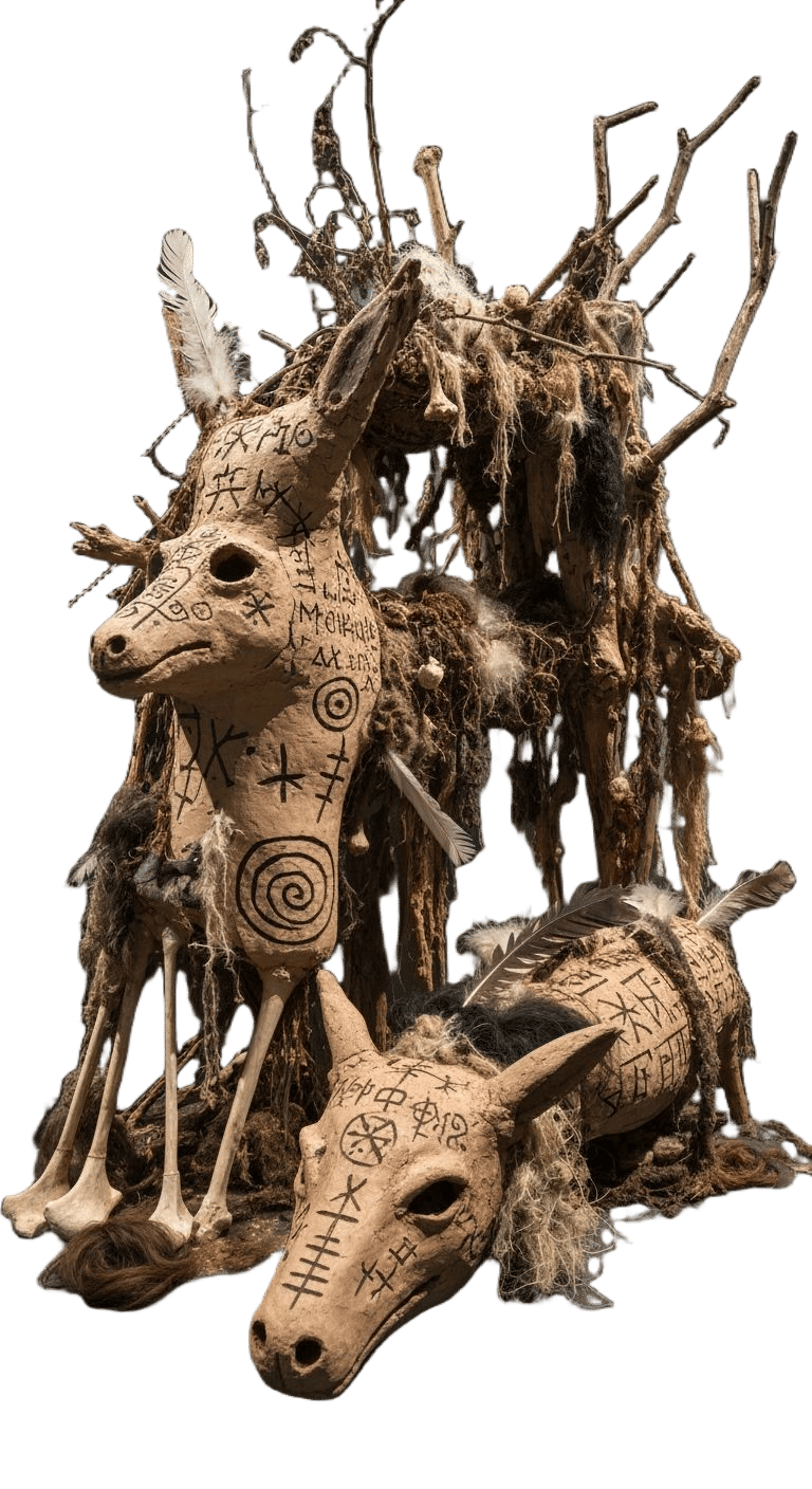 This image shows a ritualistic sculpture blending animalistic and totemic forms. The brutal outsider art style features cracked clay, aged wood, and found materials covered in hand-carved symbols, presented with dark, sacred lighting.