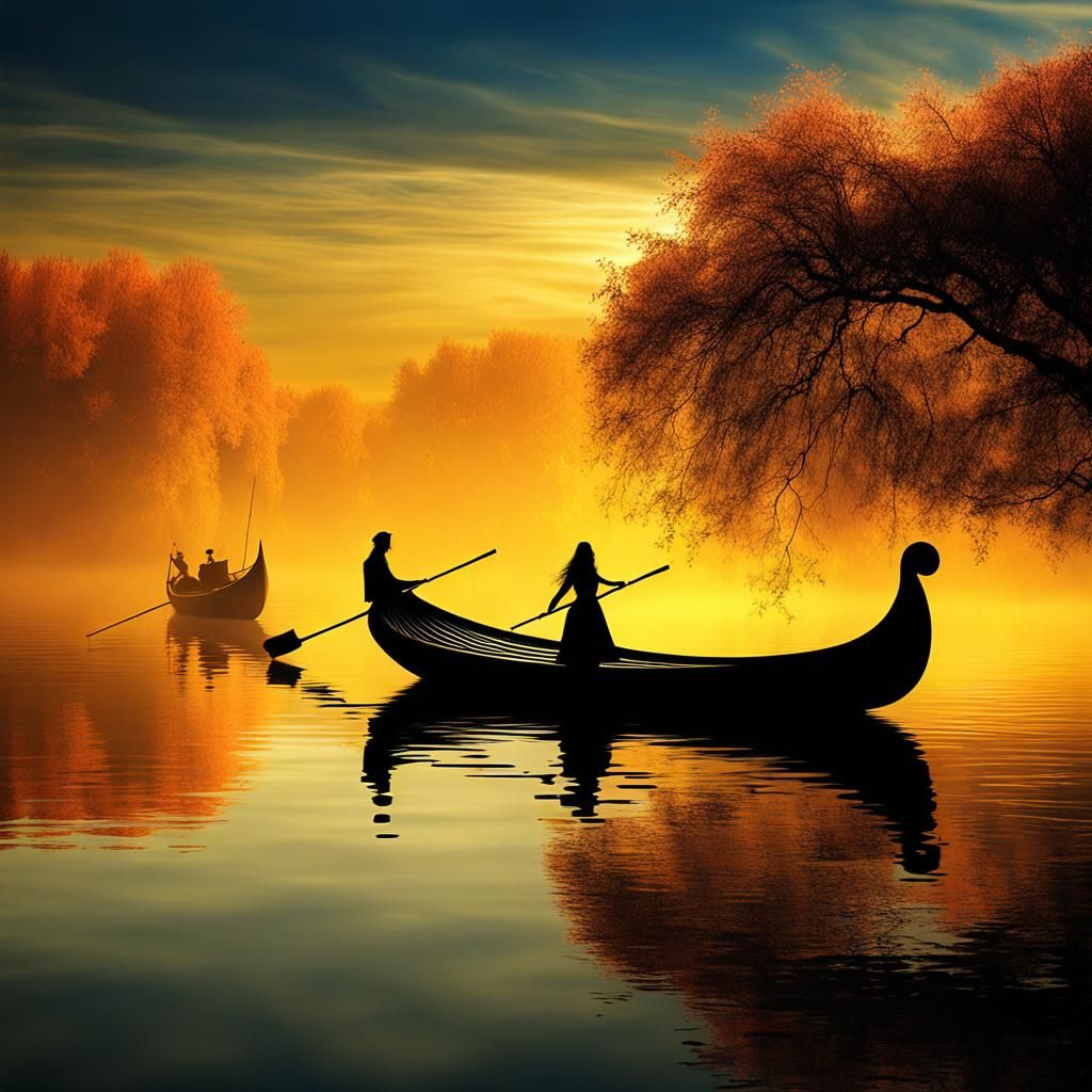This image shows a Pre-Raphaelite scene of a woman in a boat. It depicts the subject in a dreamy and ethereal style, reminiscent of romanticism.