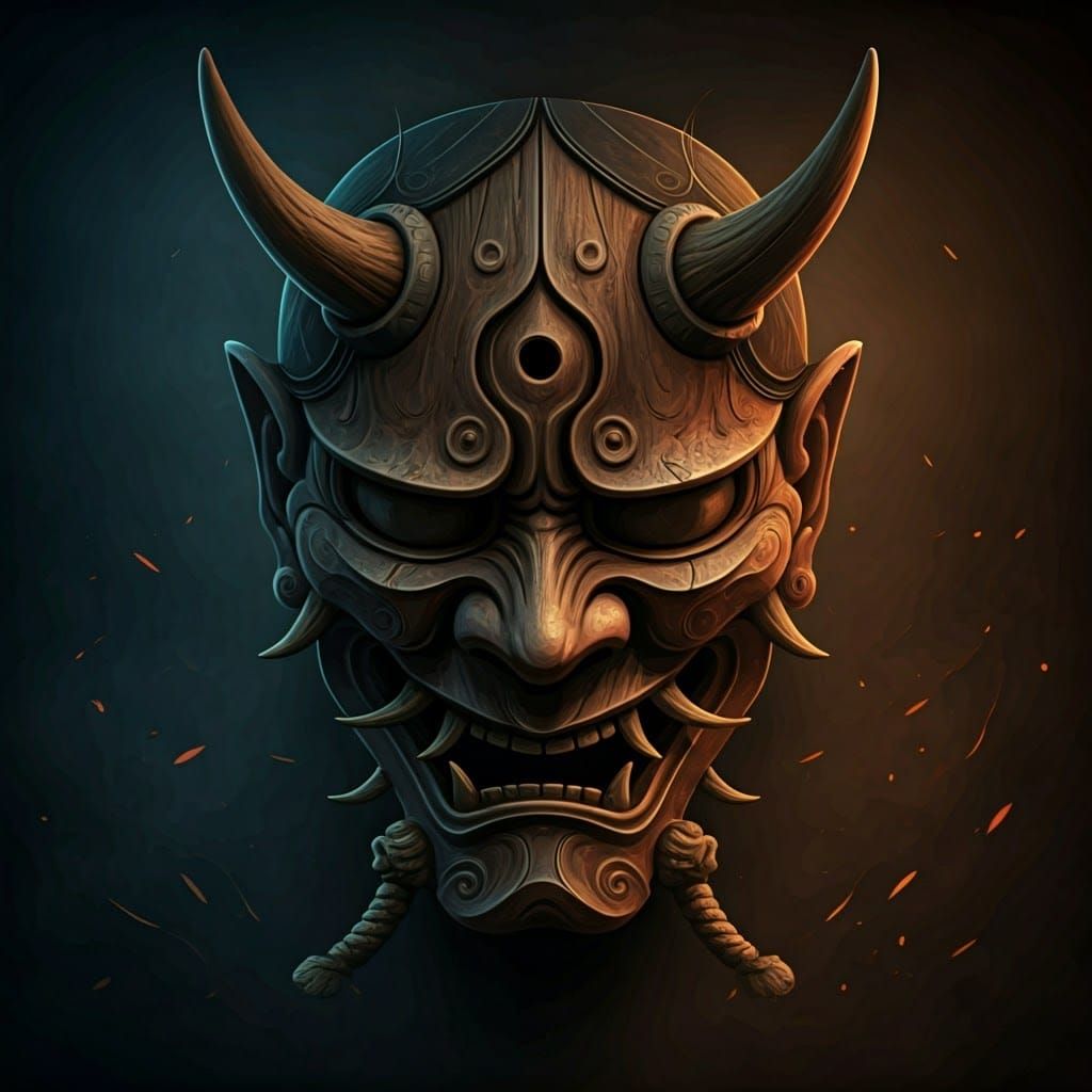 This image features a detailed, weathered oni mask against a high-contrast background, evoking ancient mystical power with intricate textures and carvings. Inspired by masterful artists, the rich palette of deep indigo, burnt orange, and mossy green creates a captivating scene.